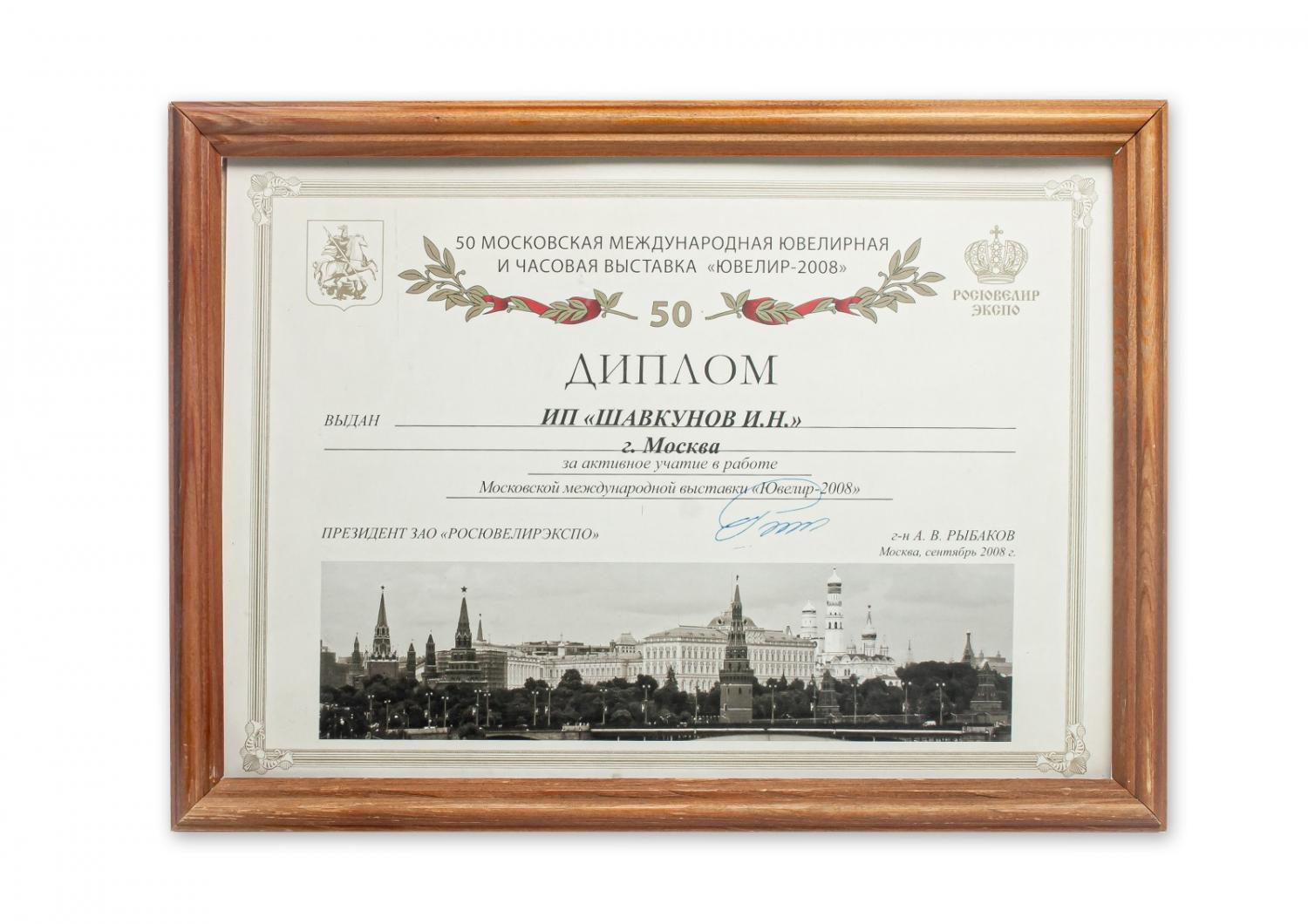 Диплом за активное участие в работе Московской международной выставке "Ювелир-2008"